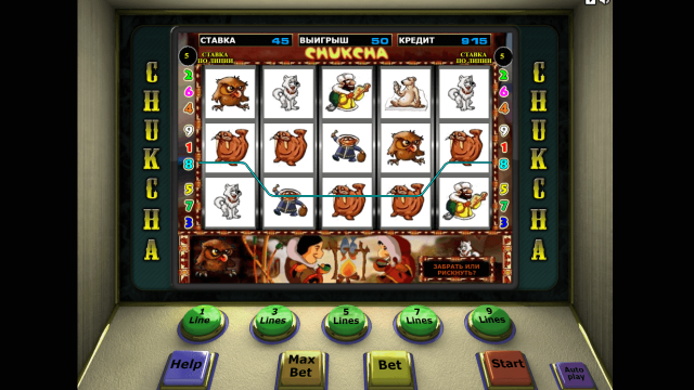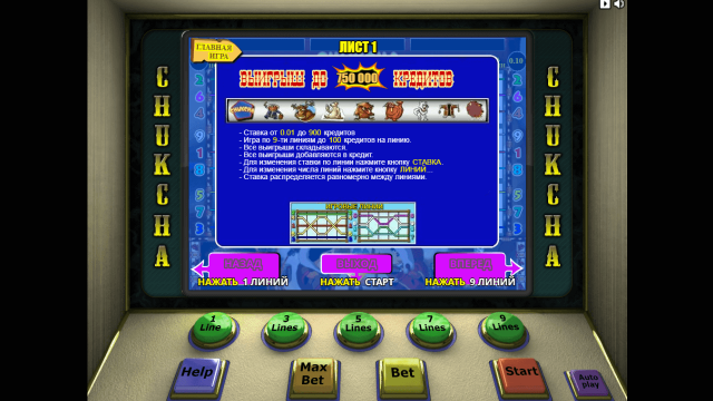 Игровой аппарат Chukchi Man отличается оригинальным сюжетом и расширенным набором бонусных опций. В слоте есть несколько спецсимволов, 2 бонус-игры и рисковый раунд. Джекпот автомата составляет 125 000 монет.