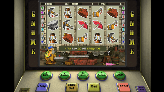 В видеослоте Gnome имеется 5 барабанов и 9 линий. Действует многоуровневая система ставок. Количество активных линий можно изменять. Стоимость одного кредита равняется одному рублю. Минимальная ставка на каждую линию — 1 руб., максимальная — 90 единиц игровой валюты.