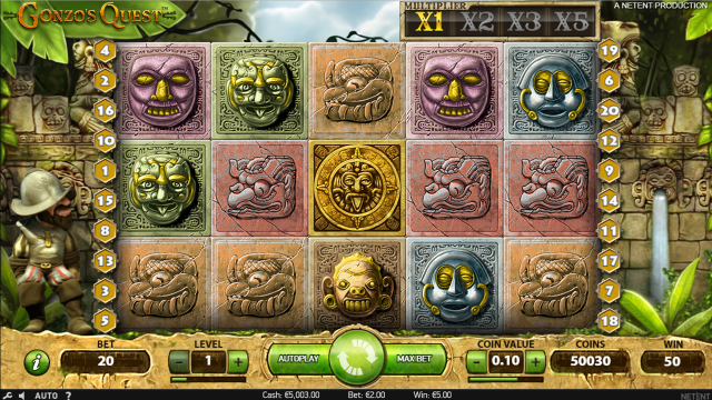 Азартный слот Gonzo’s Quest на приключенческую тематику, главный персонаж которого испанский конкистадор Гонзо. Перед началом игры гэмблер увидит мини-ролик, рассказывающий предысторию событий, в которых будет участвовать игрок. Герой постоянно присутствует на экране, он контролирует спины и реагирует на происходящее.