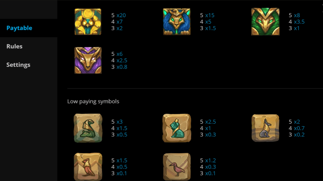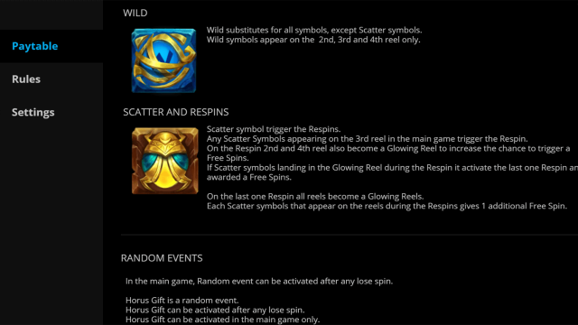 Правила игры на аппарате Восстание Гора прописаны на странице с информацией. Там же перечислены коэффициенты выплат. При игре на деньги количество кредитов нужно умножить на стоимость монеты. Лимиты ставки на линию широкие – от 1 монеты до 225. Это позволяет играть в Rise Of Horus и экономно, и на широкую ногу. Механика в цифрах: